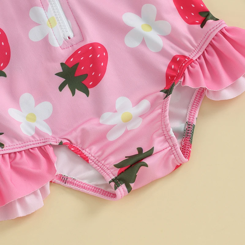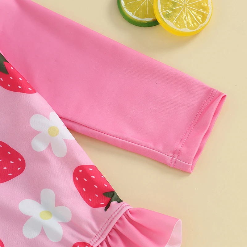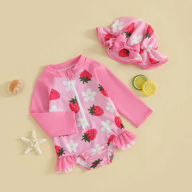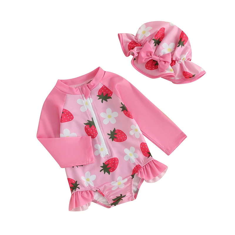 Baby Girls Swimsuit, Strawberry Flower Mermaid Bikini with Hat Newborn Swimwear for Summer Bathing
