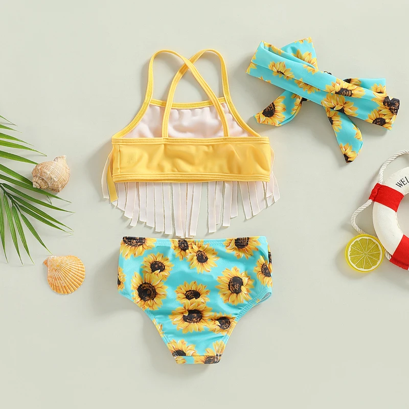 Kids Girls 3 Piece Swimsuits Solid Color Tassel Sling Tank Tops Sunflower Print Shorts Bow Headband Bikini Split Swimwear Set