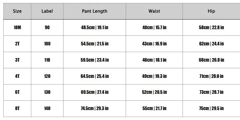 Size | Label | Pant Length | Waist | Hip |