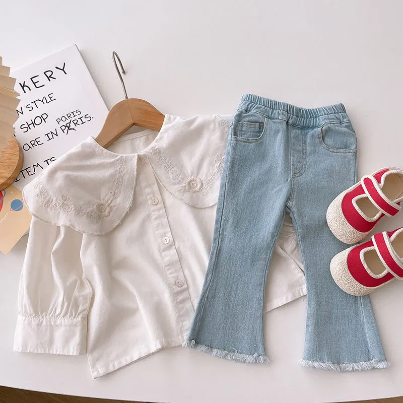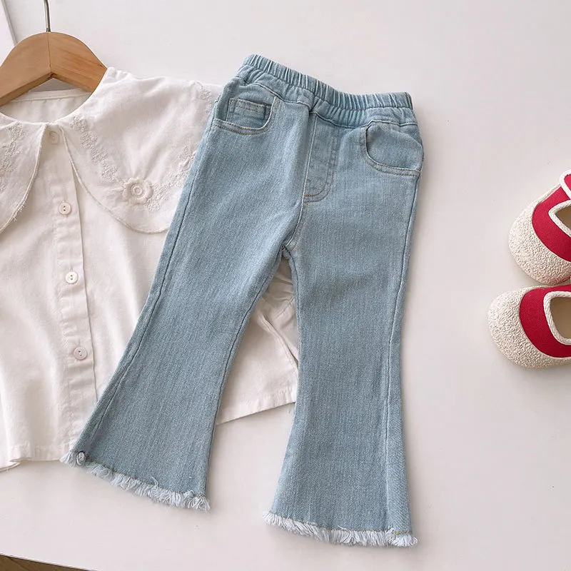 2024 New Girls Jeans Bell-bottoms Kids Pants Solid Color Baby Out Jeans For Children's Clothing Fashion Washing Water 2-8Y 2