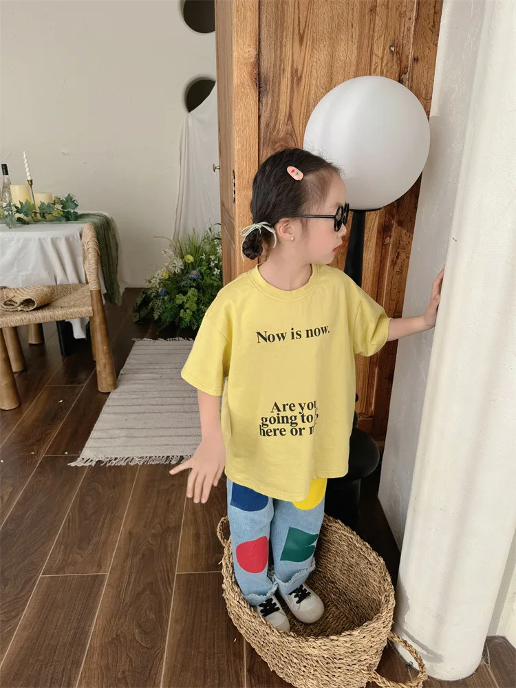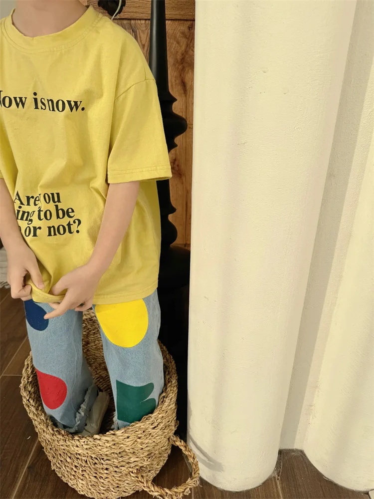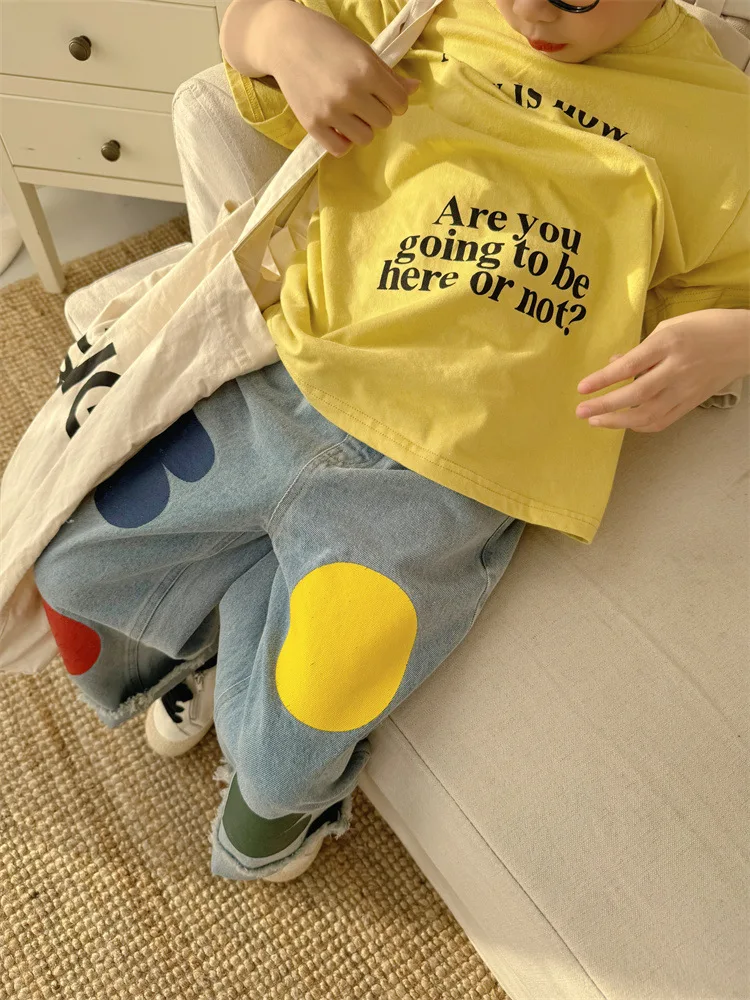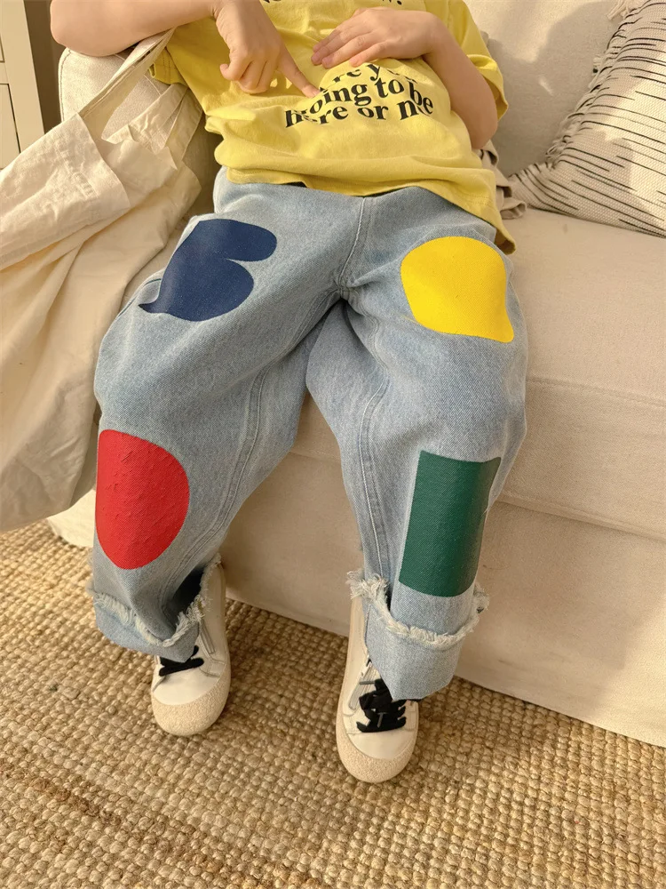 2024 Spring New Children Loose Jeans Baby Girl Color Printing Casual Pants Toddler Boy Harem Pants Kids Versatile Denim Trousers 6