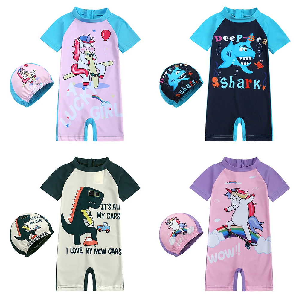 2024 Toddler Children Swimwear Suit Print UV Kids Boys Girls Summer Beach Clothes 2Pcs Cap+Bathing Swimming Diving Swimsuit