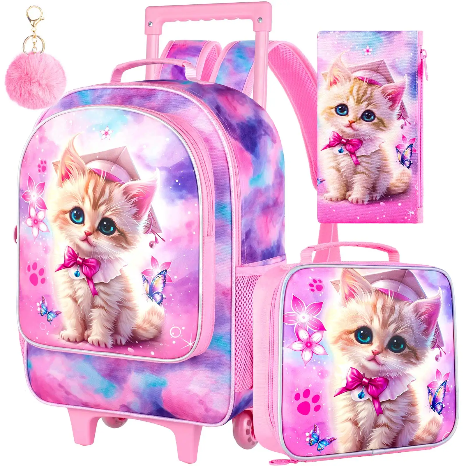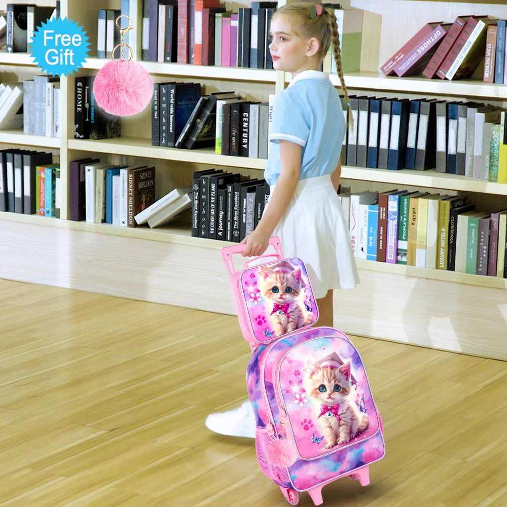 Girls Rolling Backapck 4 in 1 : Cute Cat rolling backpack + Furry Pom + lunch box+ pencil case, magic UV printing material, delicate polyester material, smooth zipper, widened and thickened shoulder straps make it feel nice and comfortable.