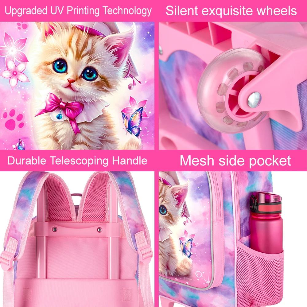 Eye-catching UV printing Design: The wheeled backpack for girls with upgrade UV cat printing patterns in front pocket, can inspire your little one to own their dreams. Best choice for your lovely to go for a trip.