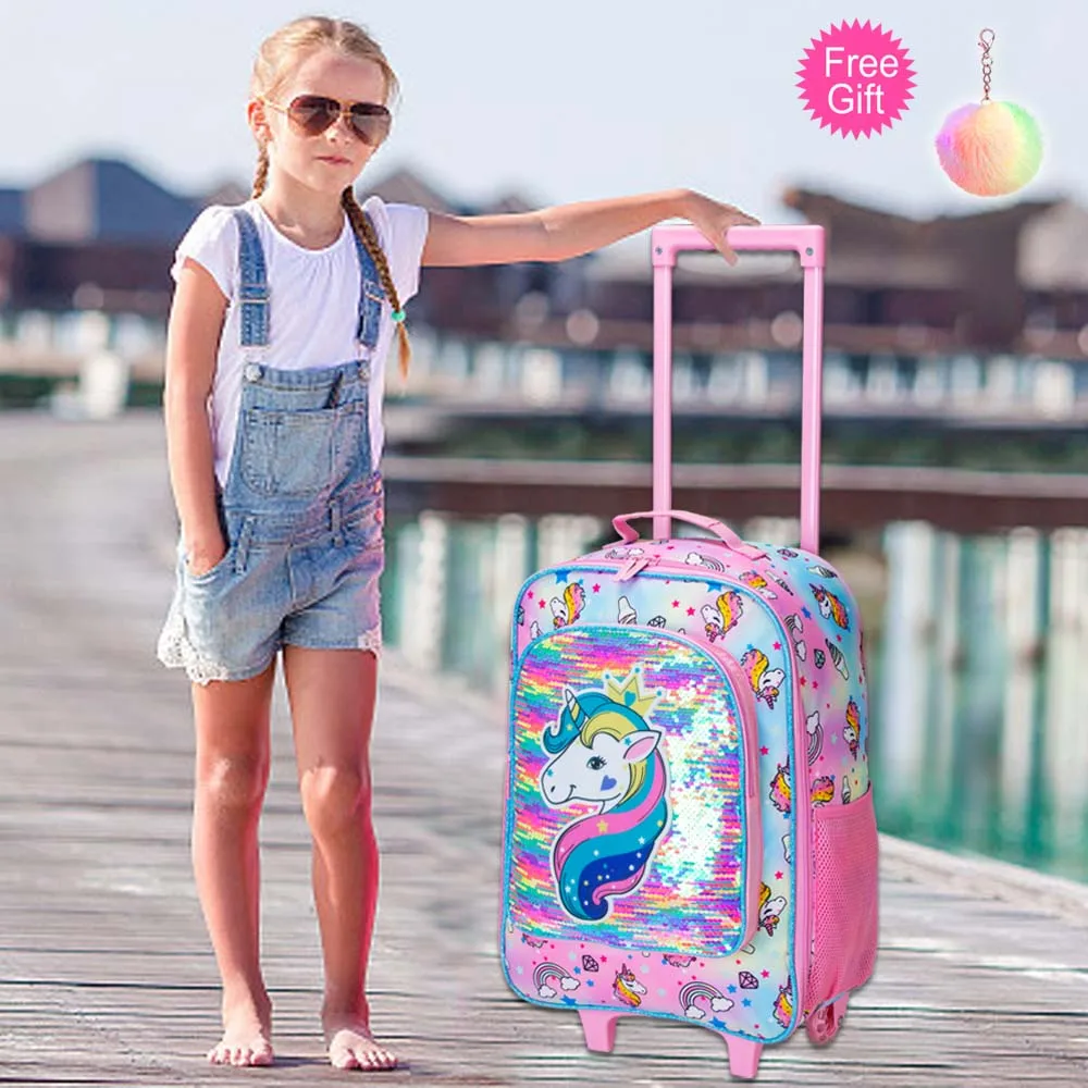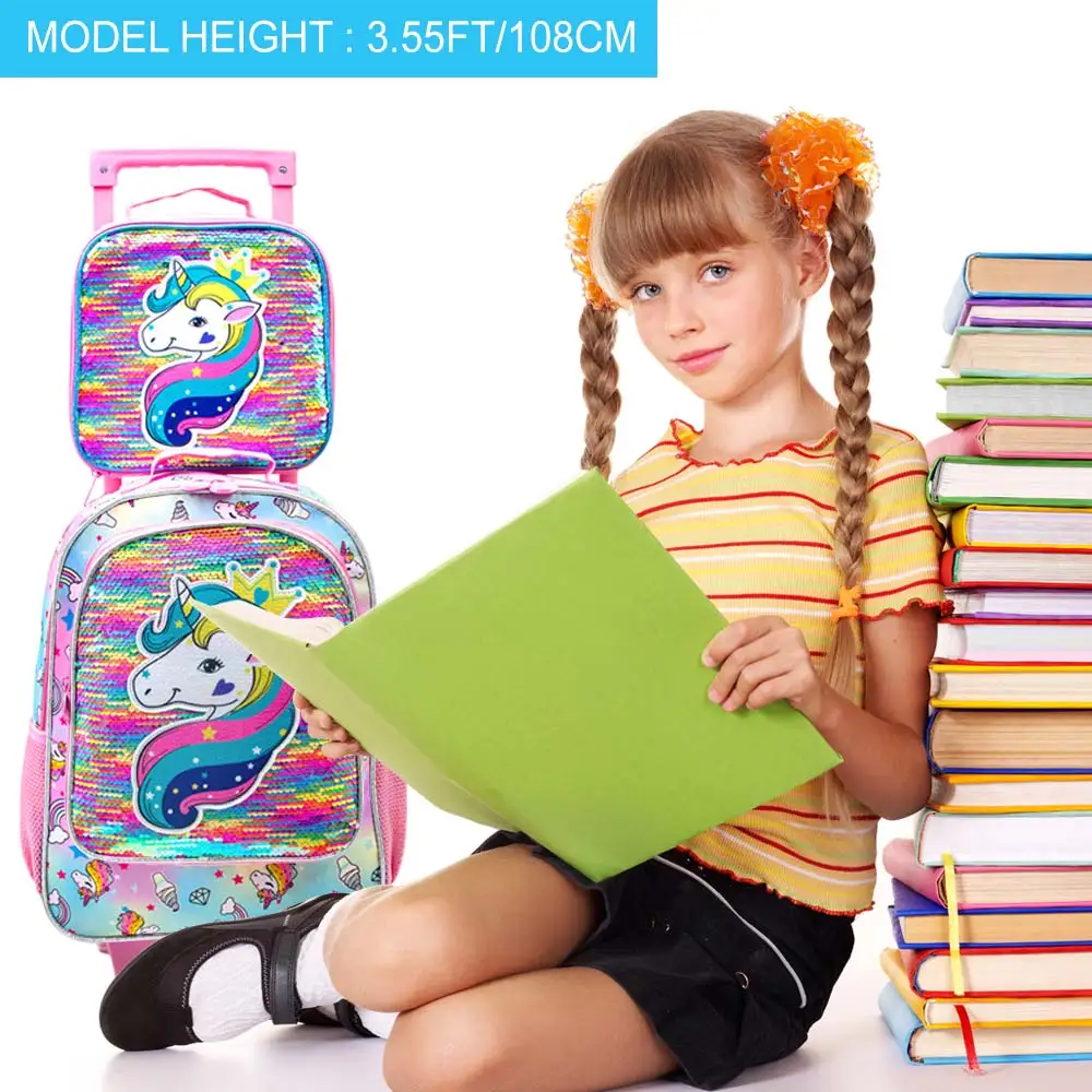 1. Girls Rolling Backapck : rolling backpack + lunch box+ pencil case, magic reversible sequin material, smooth zipper, widened and thickened shoulder straps make it feel nice and comfortable.
