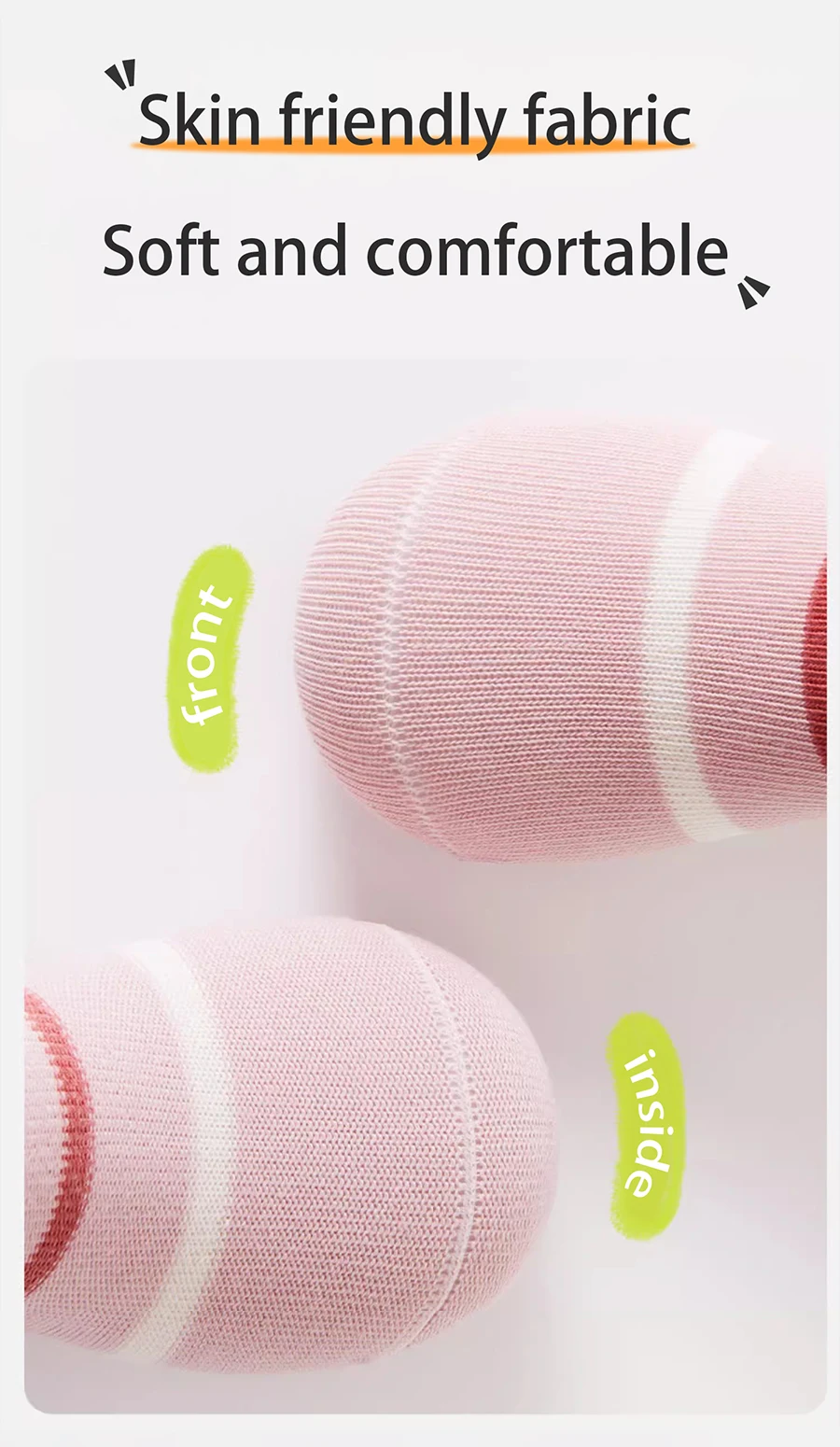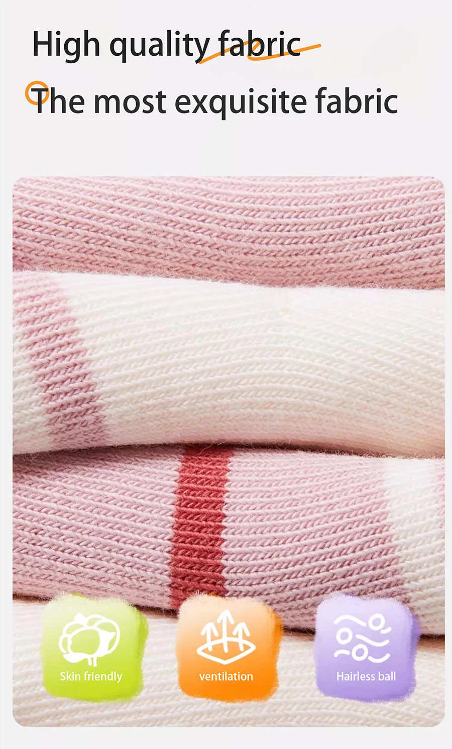 Pure polyester fiber socks are relatively hard, and excessive friction can damage the delicate skin of babies’ feet, making some babies prone to allergies. The materials we use have the softness, comfort, warmth, and breathability of cotton, as well as the fluffiness and lightness of polyester, and the high elasticity and strong stretchability of spandex. The combination of multiple materials makes our socks feel soft, breathable, sweat absorbent, durable, and less prone to pilling. The most important thing is to ensure that our baby is not allergic.