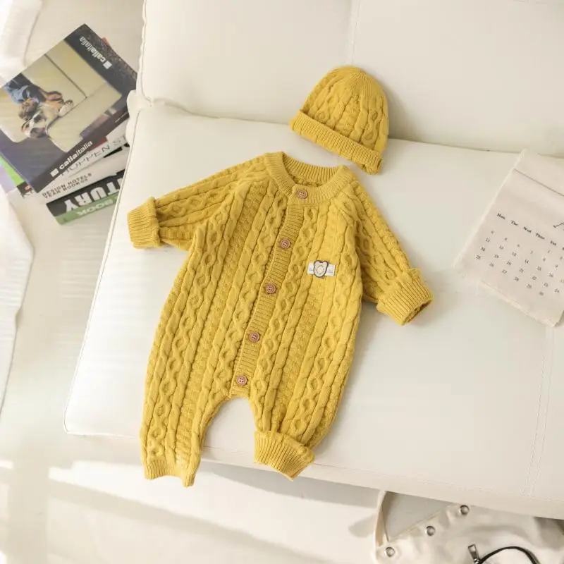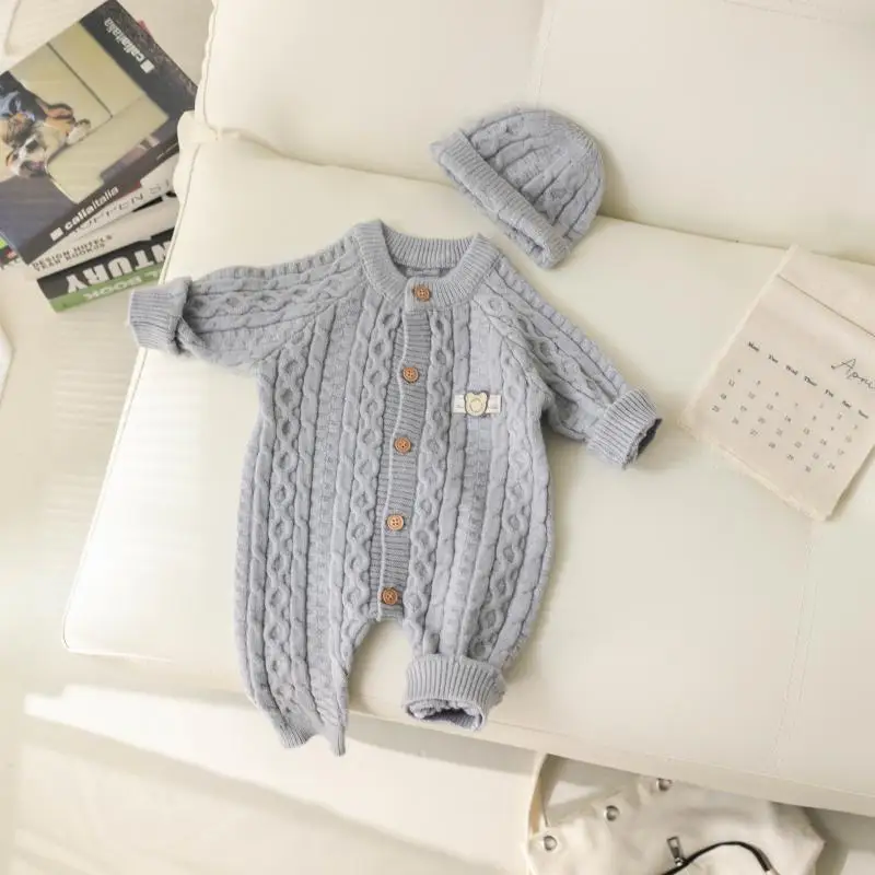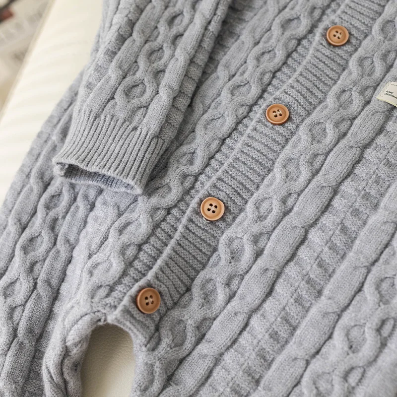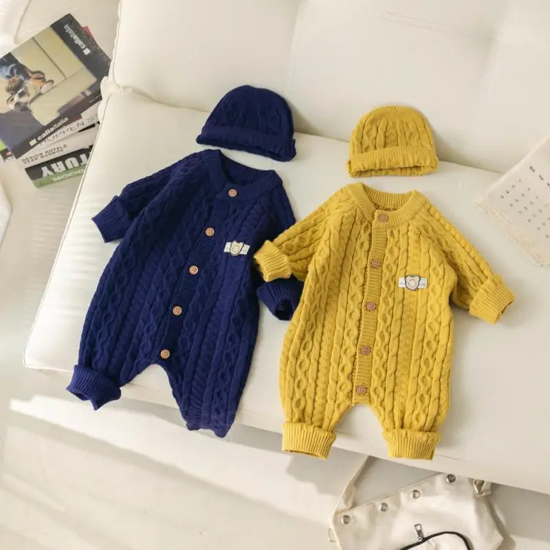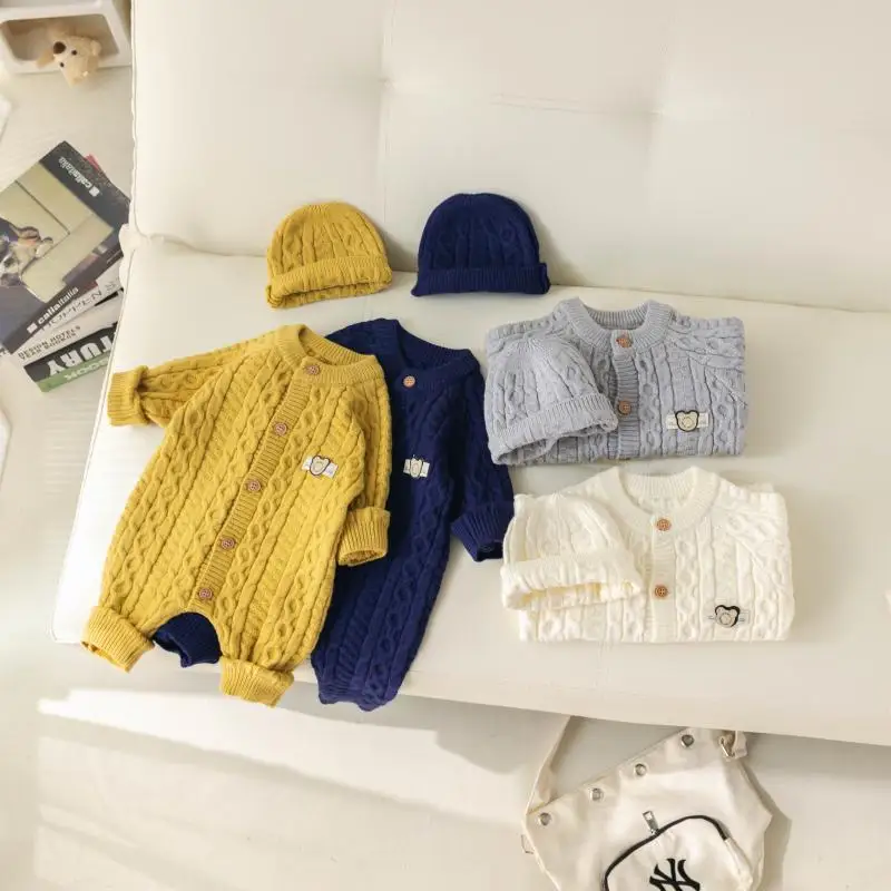 Autumn Winter Clothes Newborn Knitted Cardigan Solid Romper Girl Baby Ribbed Knit Jumpsuit Boy Infant Thick Fashion One-pieceb