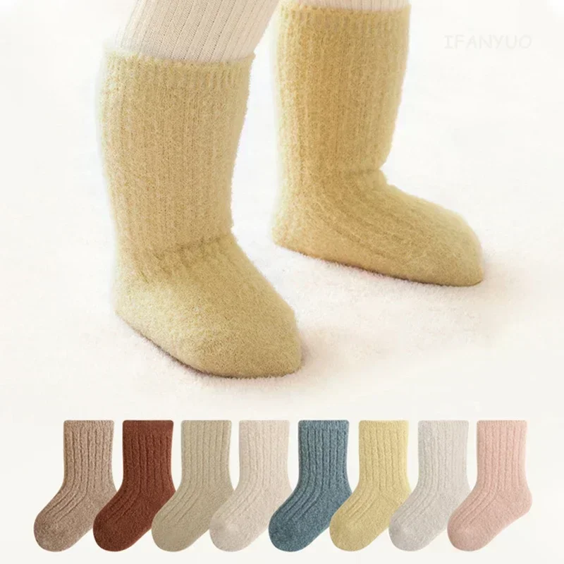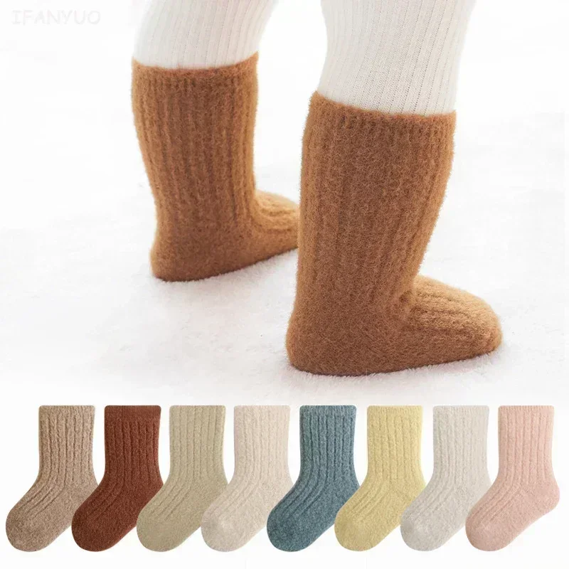 Autumn Winter New Baby Socks Thicken Velvet Terry Newborn Boy Girl Warm Stockings Solid Knitted Infant Children Mid Tube Socken