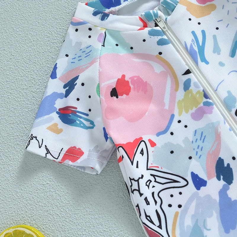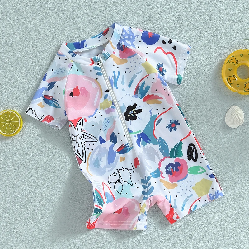 Baby Girls Boys Rash Guard Swimsuit Playsuits Watercolour Print Zipper Short Sleeve Sun Protection Bathing Suit