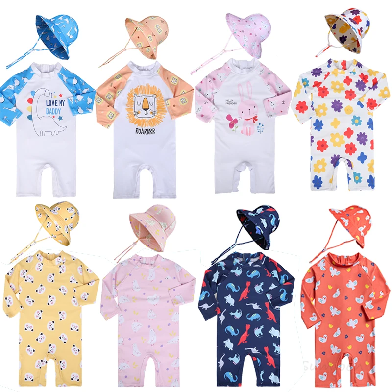 Baby Girls Swimsuit Long Sleeves One Piece Swimwear for Kids Toddler Cartoon UPF50+ Rash Guards Infant Bathing Suit Korea Sets 1