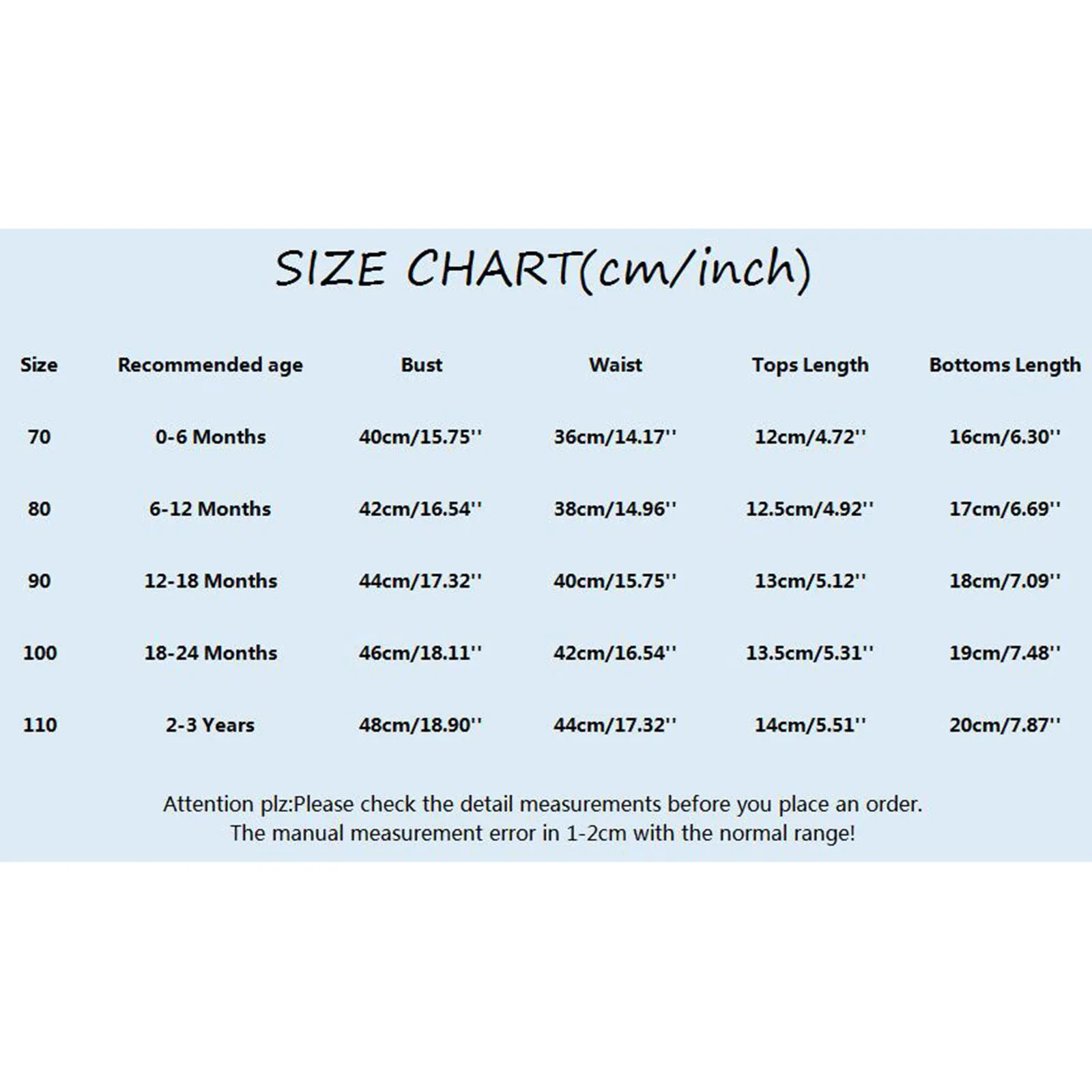 | Size:70 | Recommended age:0-6 Months | Bust:40cm/15.75” | Waist:36cm/14.17” | Tops Length:12cm/4.72” | Bottoms Length:16cm/6.30” |