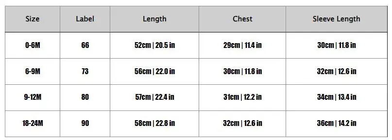 0-6M | 66 | 52cm | 20.5 in | 29cm | 11.4 in | 30cm | 11.8 in |