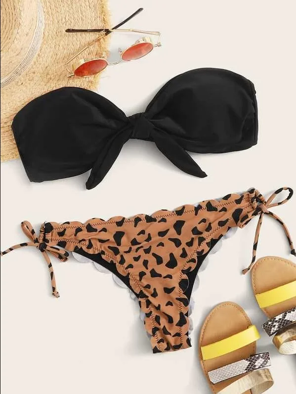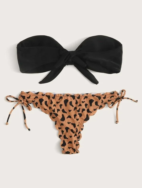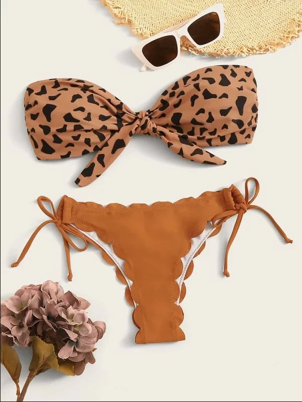 Beach Bikini 2024 Woman Sexy Front Lace Up Tie Bandeau Leopard Swimsuit Female Push Up Ruffled Bow Bathing Suit Thong Swimwear 1