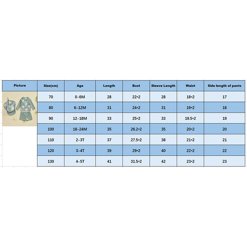 80 Tops Length: 12.2 Bust: 18.9 Sleeve: 12.2 Waist: 14.96 Shorts Length: 7.09 Suggest Age: 6-12 Months