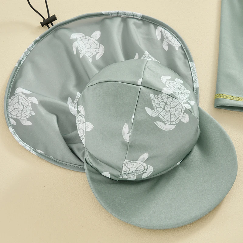 Boys Rash Guard Swim Set, Long Sleeve Turtle Print T-shirt with Shorts and Hat Swimwear