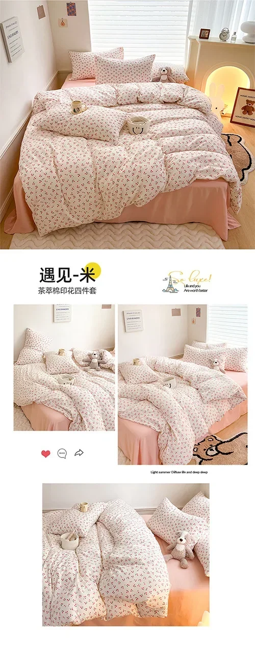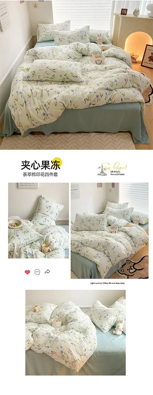 Class A Double Layer Yarn Four Piece Bedding Set Cartoon Cute Bed Sheet Quilt Set Fitted Sheet Cotton Linen Four Piece Set 4