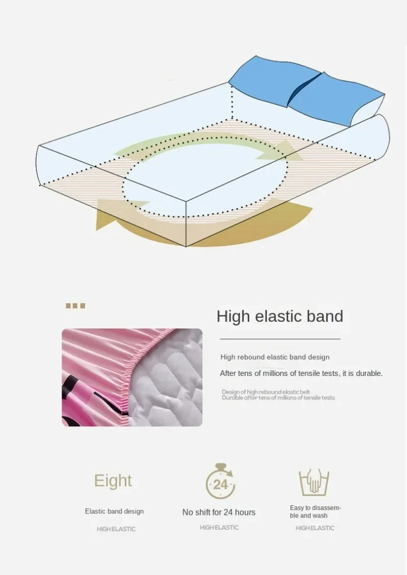 C-shaped fixed elastic band design around, fixed on the mattress, the bed surface is flat and clean, easy to take care of.