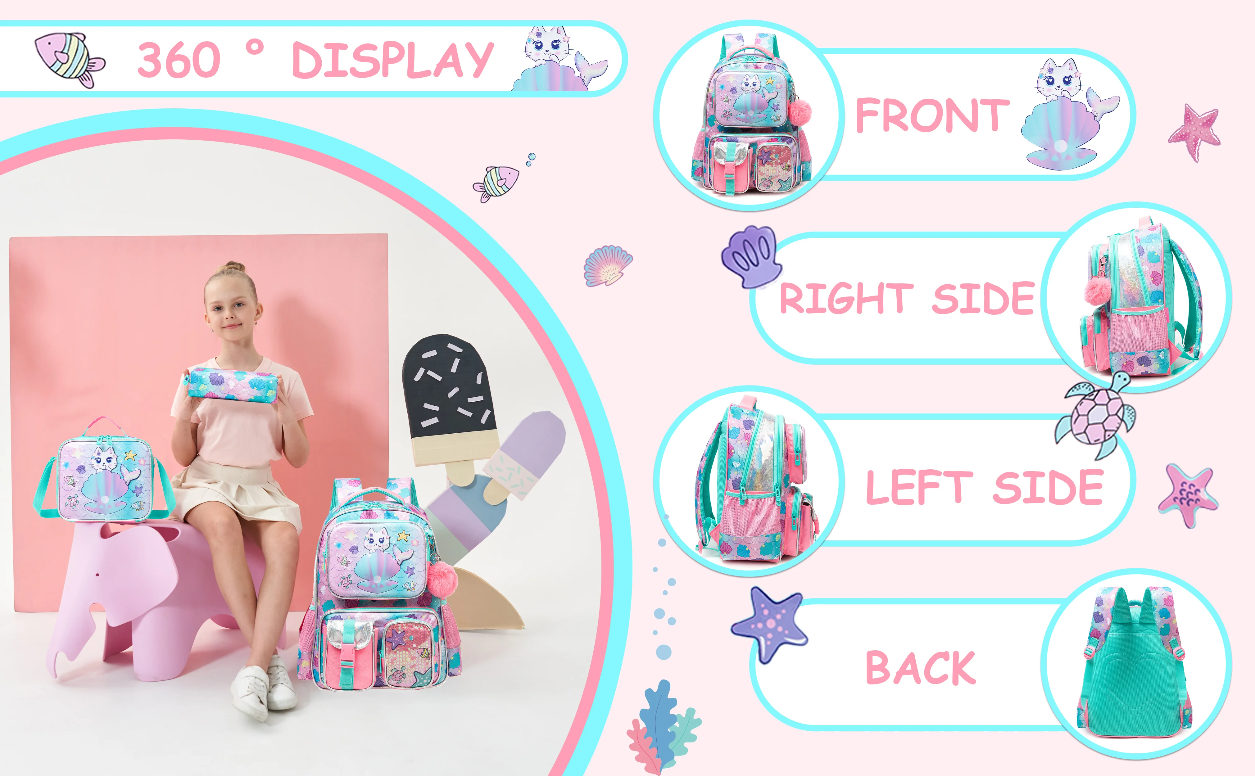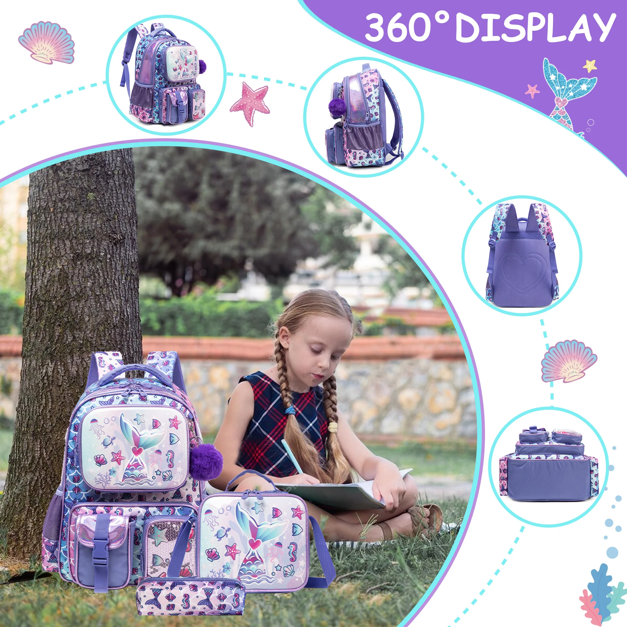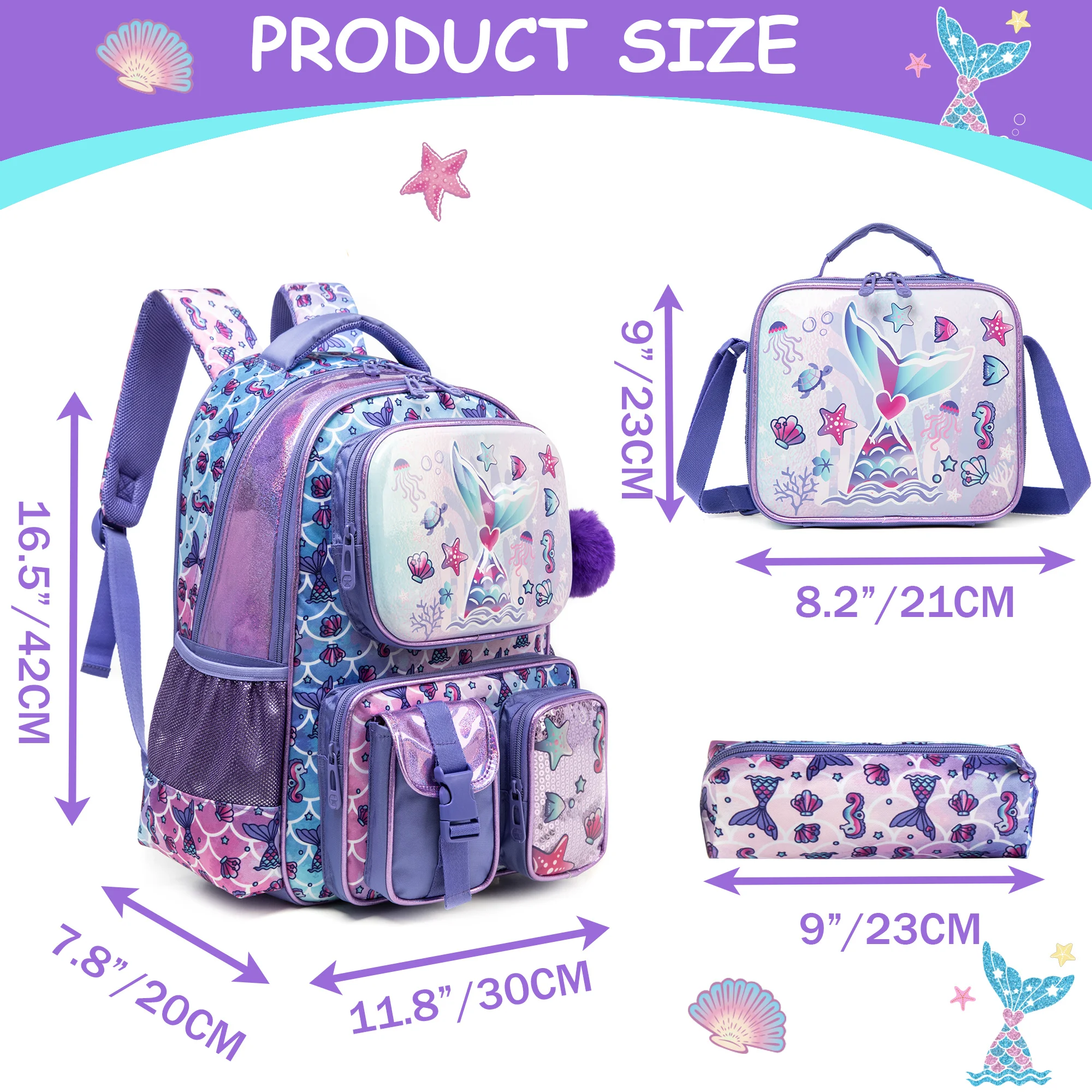 • [Girls Mermaid Backpack Size]:Backpack:16.5″X11.8″X7.8″ ;Lunch Box:9″X8.2″X3.9″;Pencil Case9“
