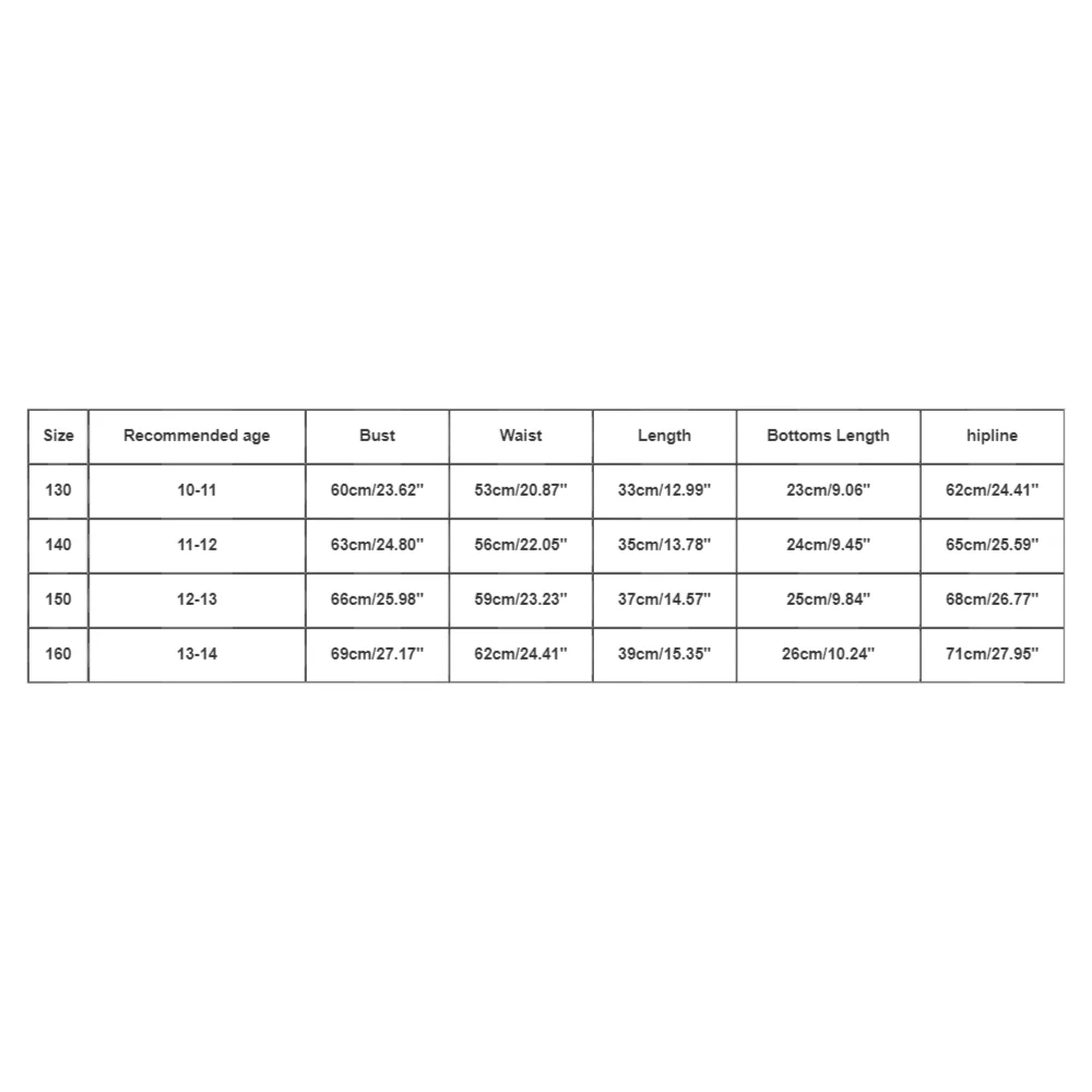 Size:160Recommended age:13-14Bust:69cm/27.17”Waist:62cm/24.41”Length:39cm/15.35”Bottoms Length:26cm/10.24”hipline:71cm/27.95”