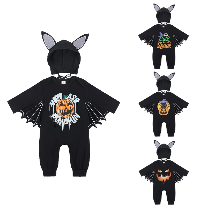 Halloween Baby Jumpsuit Pumpkin Head Skull Bones Infant Costume Bat Romper Long Sleeve Round Neck Button Suit 2Pcs Clothes Set