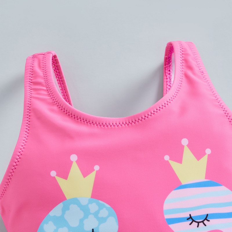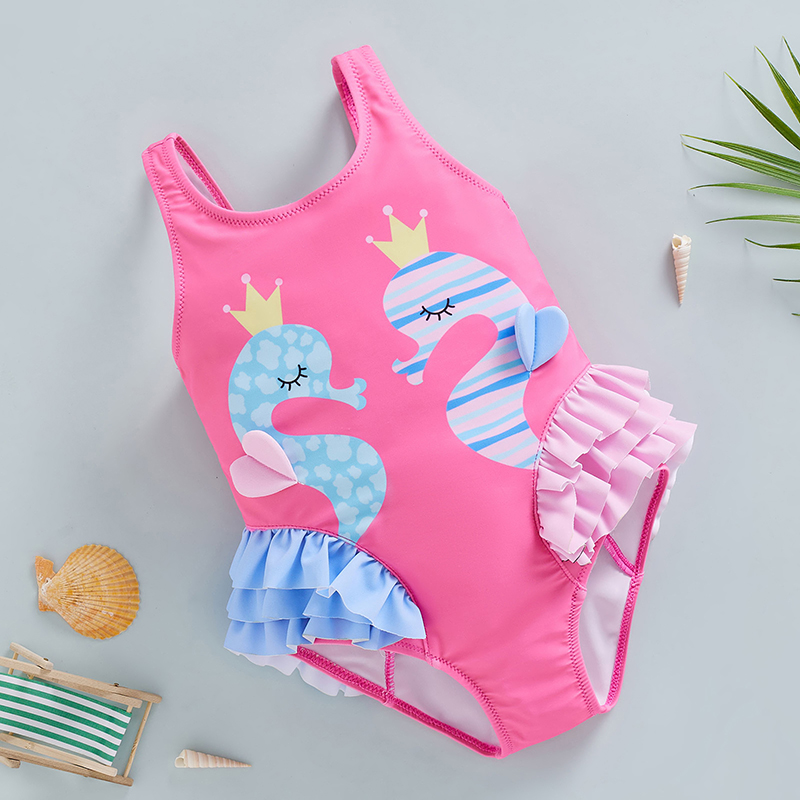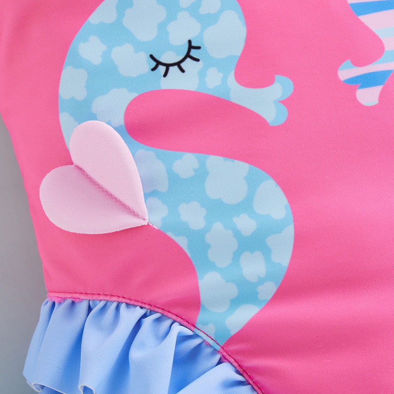 Cartoon seahorse print, ruffles, bowknot backless, sleeveless jumpsuit swimsuit, sweet and cute baby girl summer bikini beachwear.