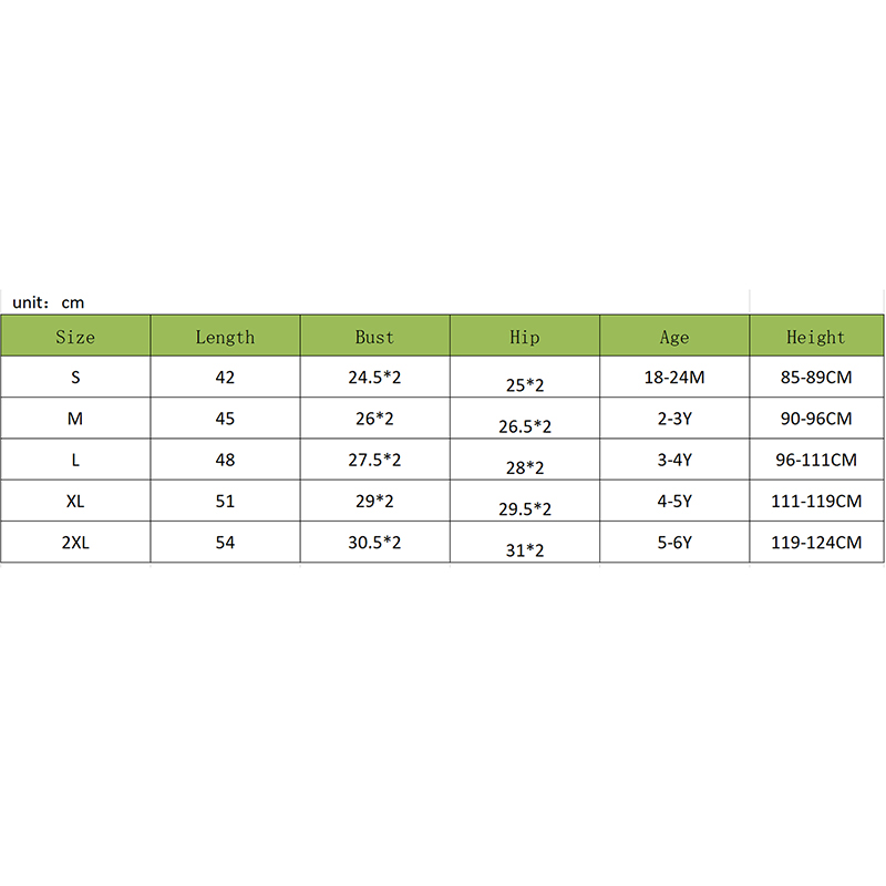 XL Advised Age: 4-5 Years Length: 51 / 20.08 Bust: 58 / 22.83 Hip: 59 / 23.23