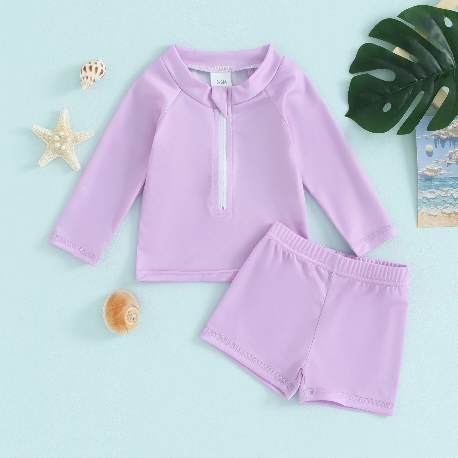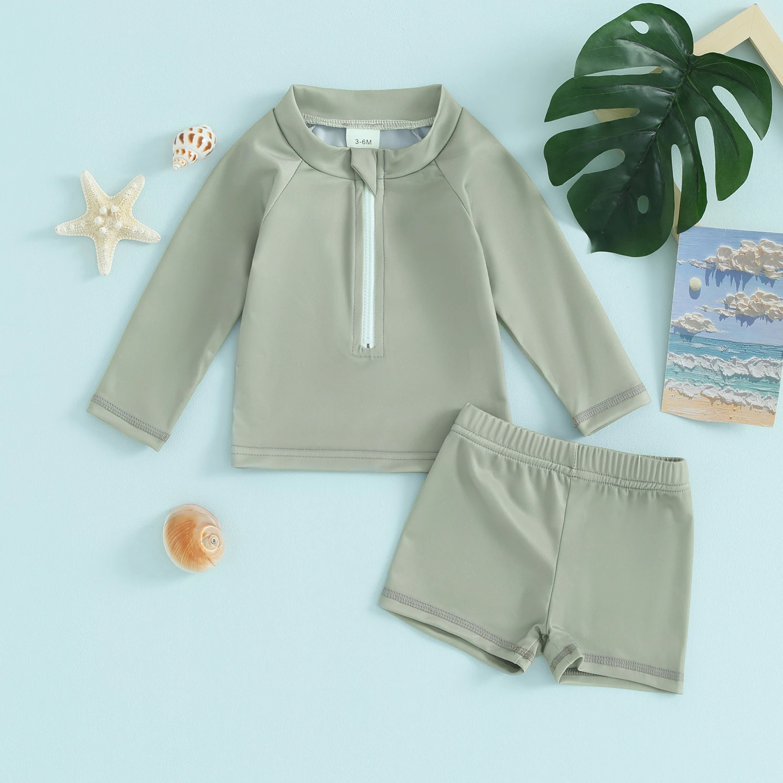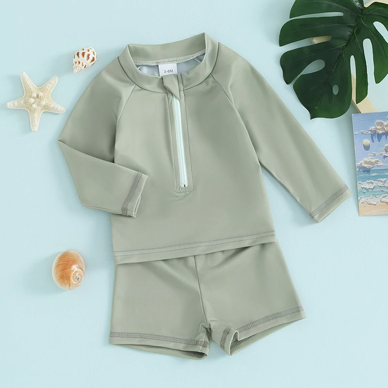 Boys and Girls 2 Piece Swimwear Set, Round Neck Front Zipper Long Sleeve Swimsuit + Swim Shorts Infant Toddler Beach Wear