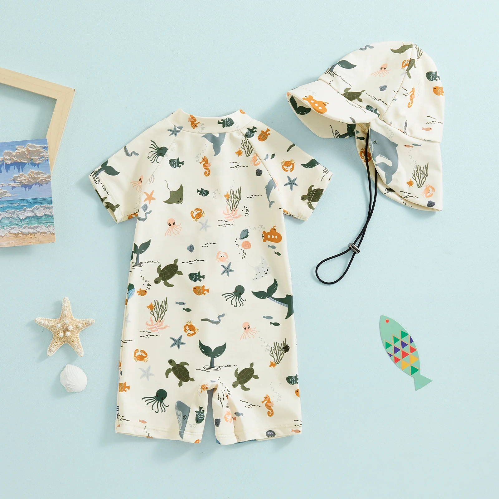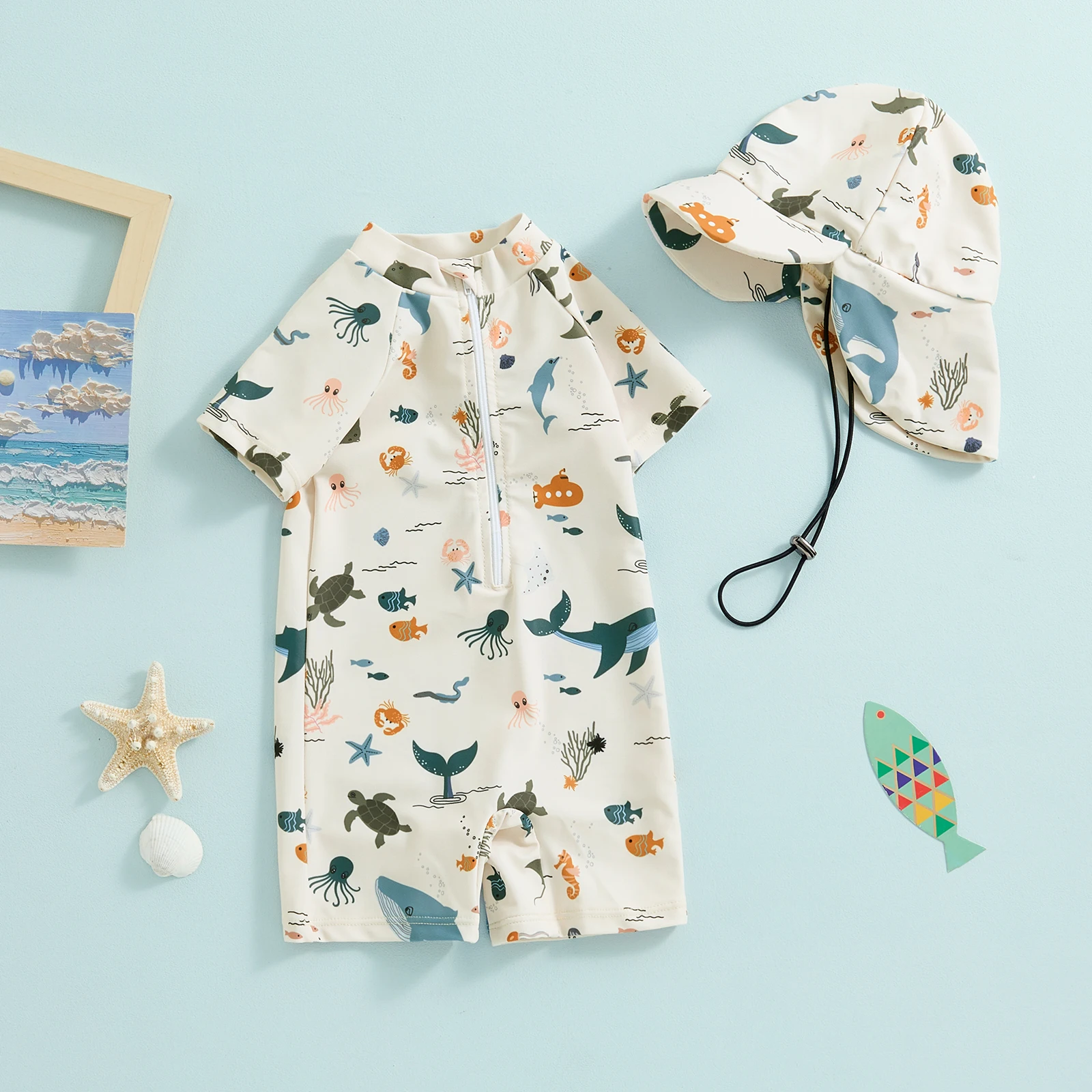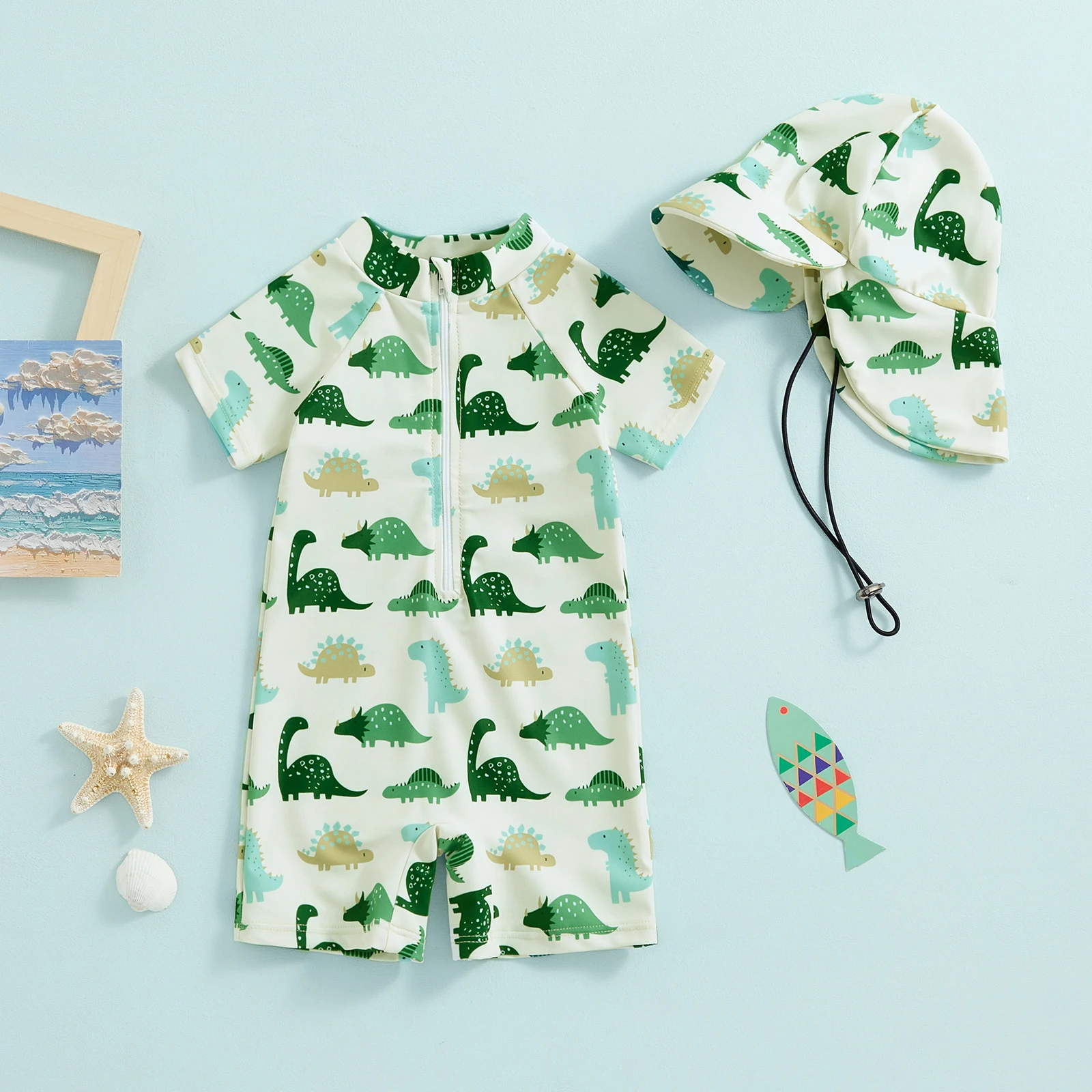 Children Baby Boys Zipper Swimwear + Hat Swimsuit Sun Protection Toddler Beachwear Short Sleeve Animal Print Bathing Suit 1