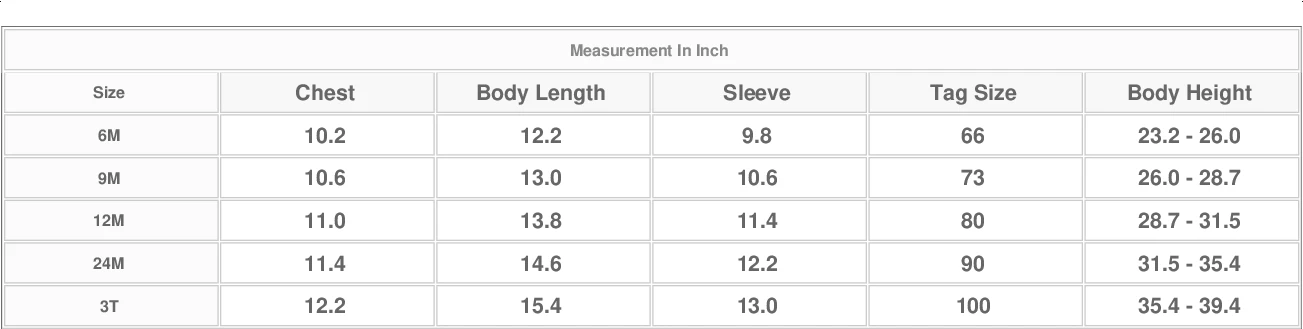 Size | Chest | Body Length | Sleeve | Tag Size | Body Height |