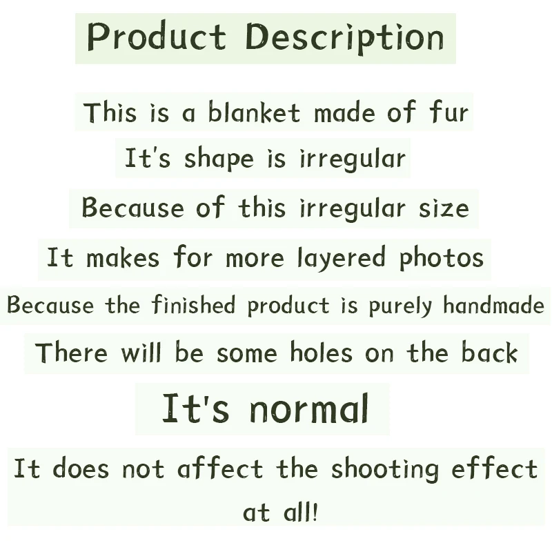 This is a blanket made of fur, with an irregular shape. It is precisely because of this irregular size that you can take photos with a layered feel. Because the finished product is purely handmade, it is normal to have a few holes on the back, which will not affect the shooting effect at all!