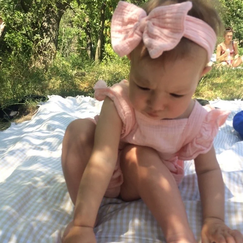 Organic Cotton Baby Girl Clothes Summer New Double Gauze Kids Ruffle Romper Jumpsuit Headband Dusty Pink Playsuit For Newborn 3M 5