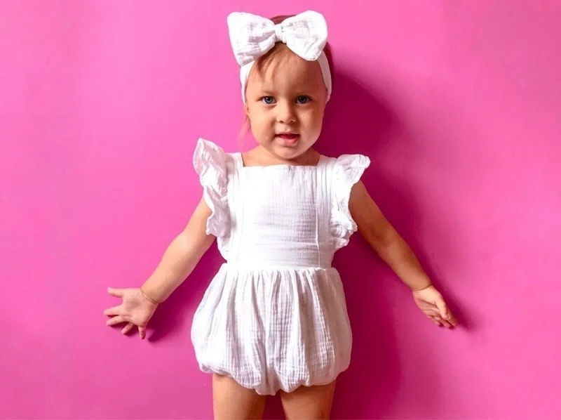 Home Babies & Kids Baby Clothing Jump Suits Organic Cotton Baby Girl Clothes Summer New Double Gauze Kids Ruffle Romper Jumpsuit Headband Dusty Pink Playsuit For Newborn 3M