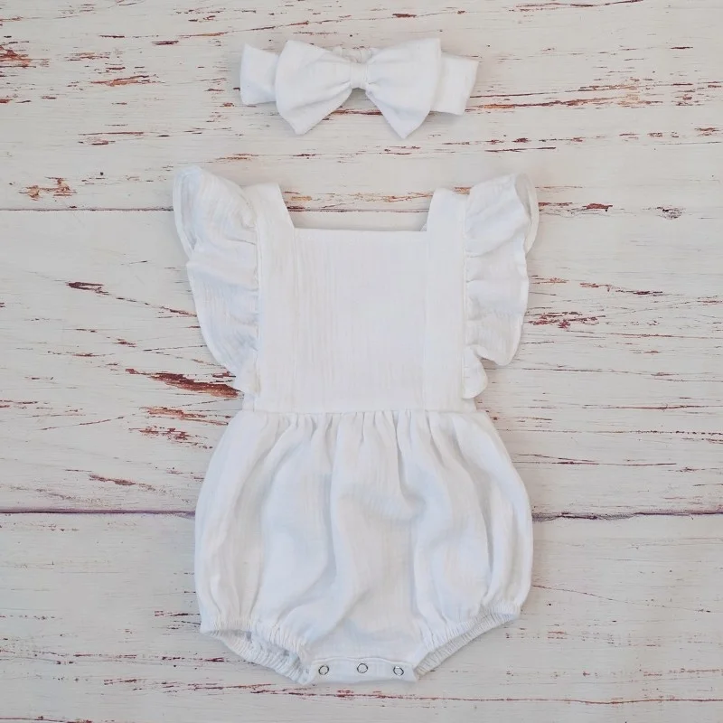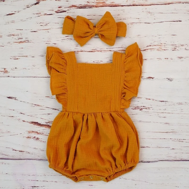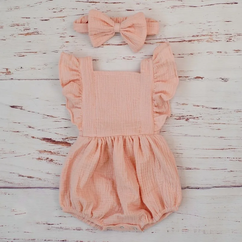 Organic Cotton Baby Girl Clothes Summer New Double Gauze Kids Ruffle Romper Jumpsuit Headband Dusty Pink Playsuit For Newborn 3M 4