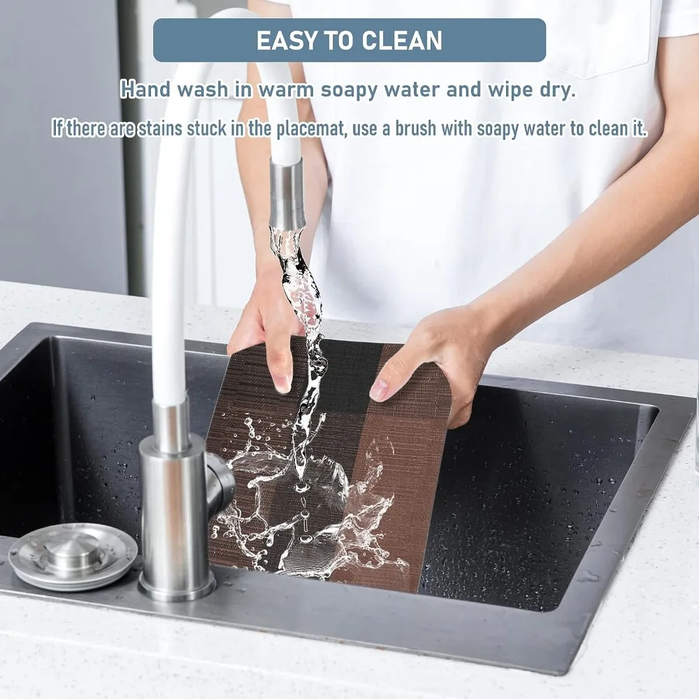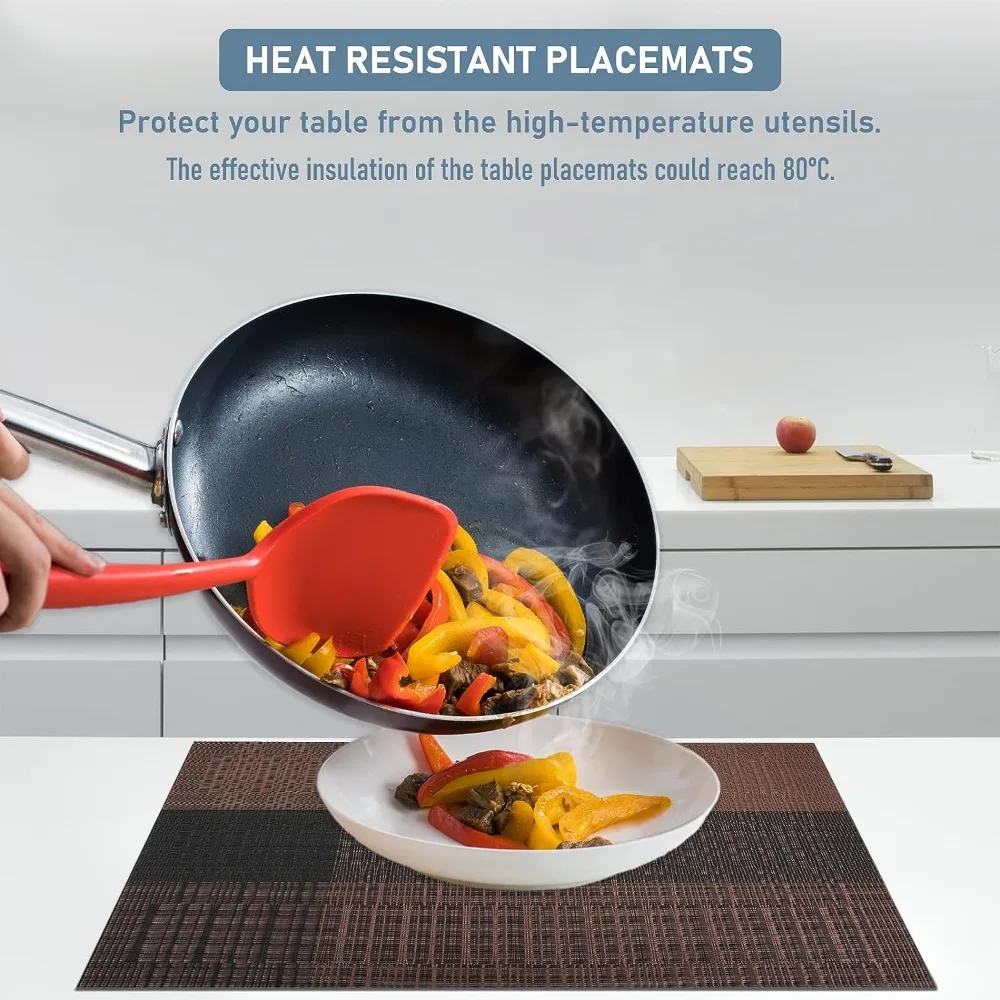 HEAT RESISTANT: They are widely applicable placemats that have improved heat insulation thus excellent for holding hot plates and mugs. Placemats heat resistant can reach up to 176°F (80°C), which protects your dining table from hot food. It is suitable for all hot drinks and plates, protect your dining table from scalding.