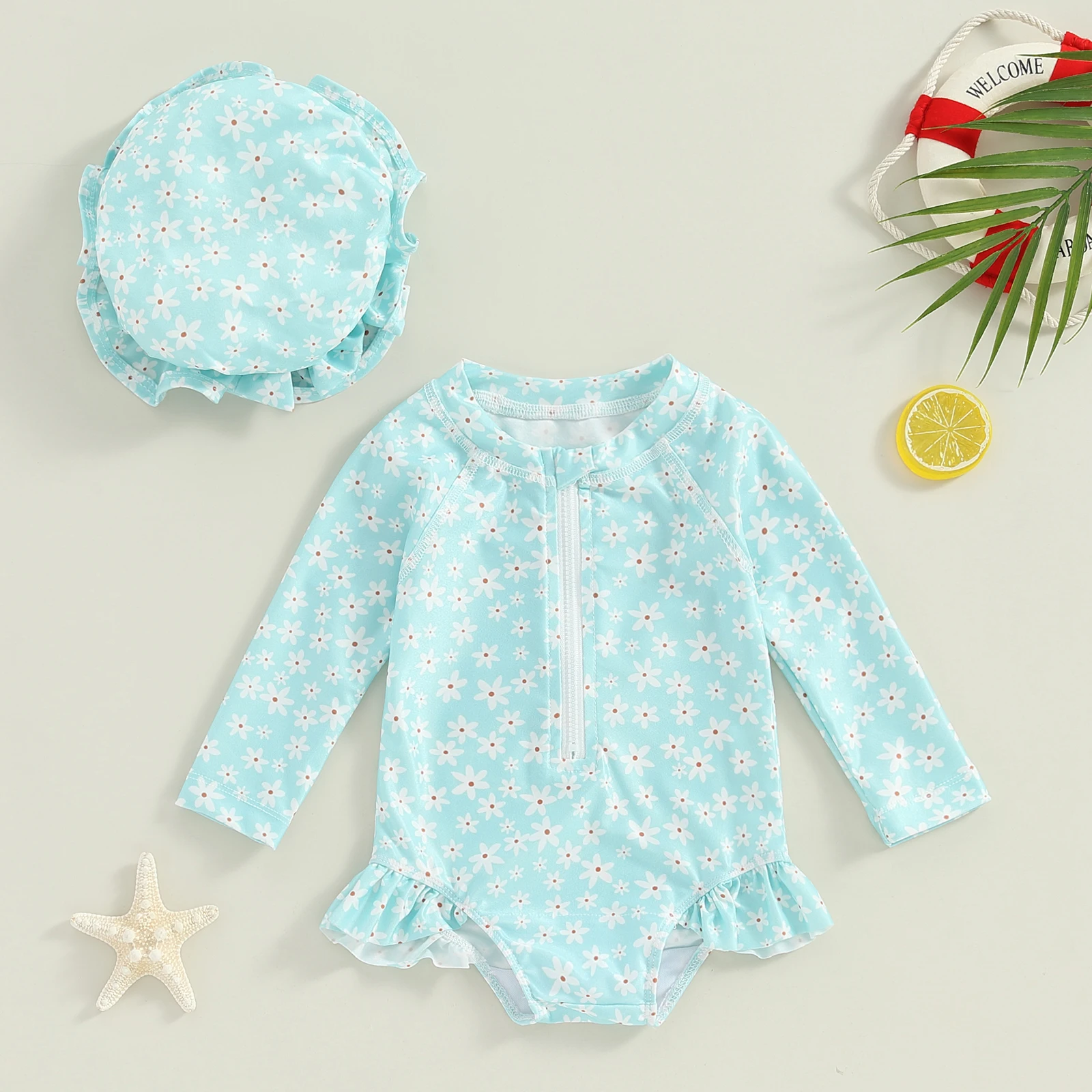 Toddler Girls Rash Guard Swimsuit 2pcs Bathing Suit + Sun Hat Set Infant Long Sleeve Floral Print Ruffles Swimwear with Swim Cap 2