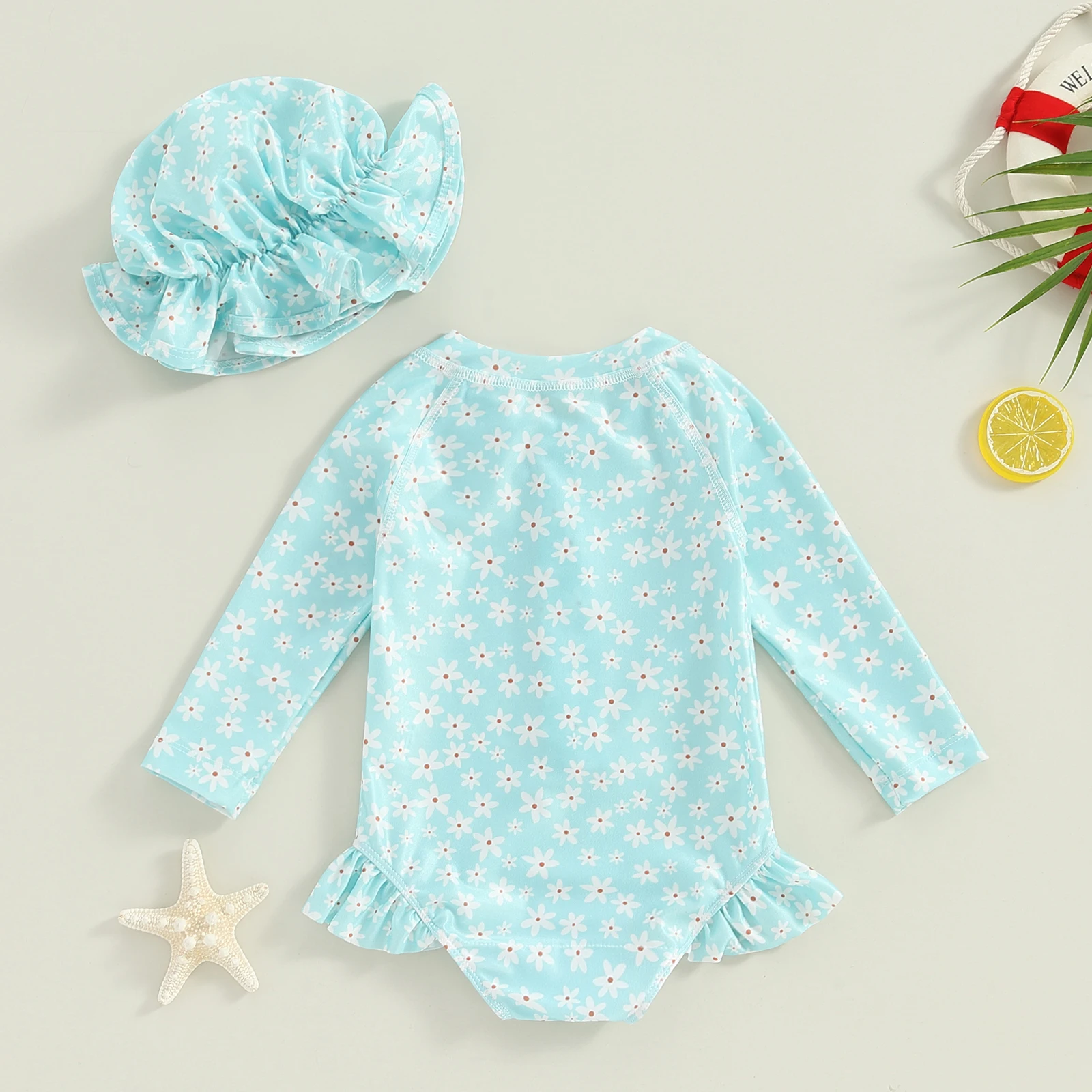 Home Babies & Kids Baby Clothing Baby Swimwear Toddler Girls Rash Guard Swimsuit 2pcs Bathing Suit + Sun Hat Set Infant Long Sleeve Floral Print Ruffles Swimwear with Swim Cap