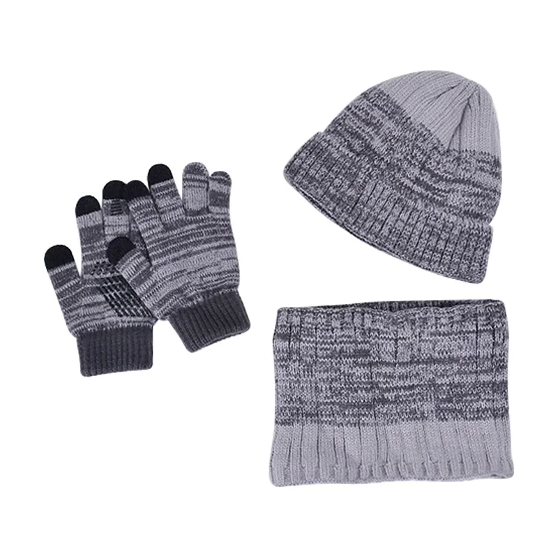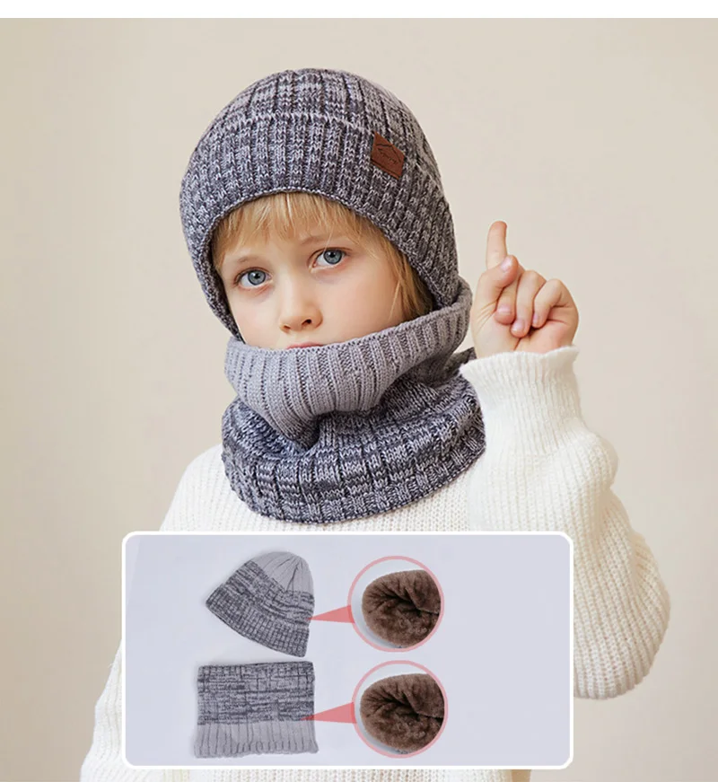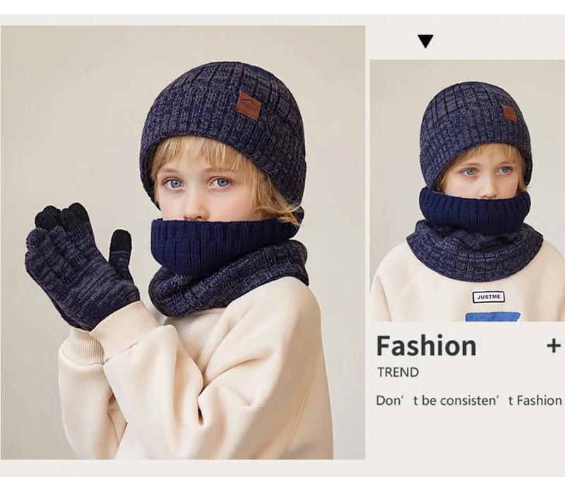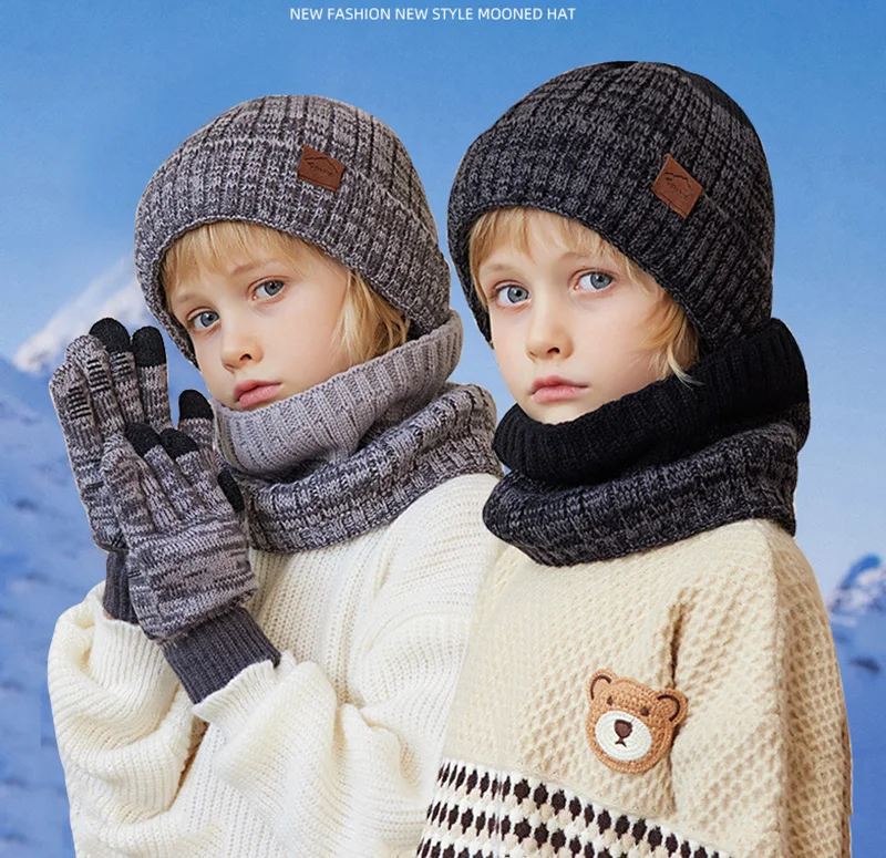 Winter Children Hat Scarf Gloves Set Knitted Beanie Thicken Velvet Lining Hats for Boys Girls Neck Warmer Scarves Mitten 4-10Y