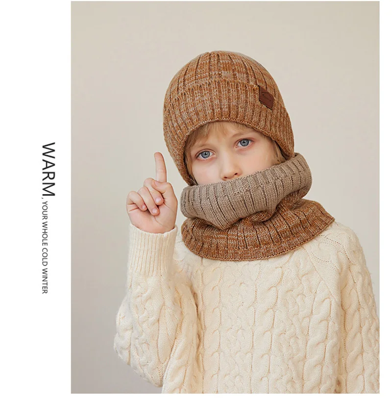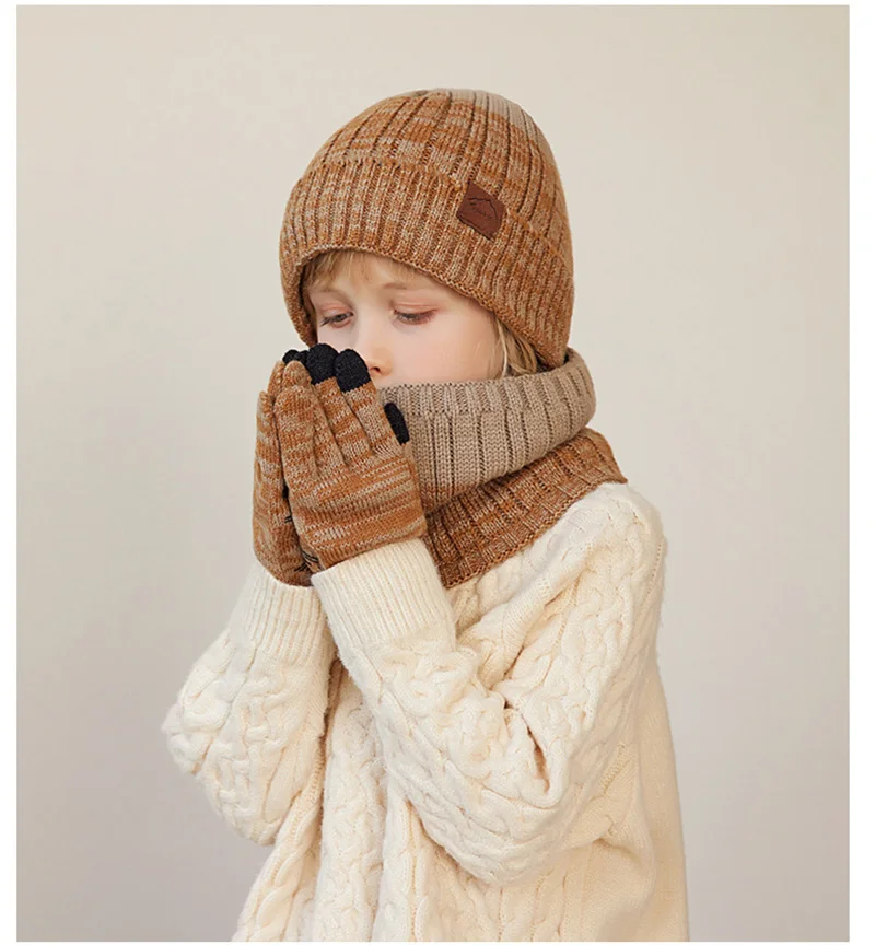Winter Children Hat Scarf Gloves Set Knitted Beanie Thicken Velvet Lining Hats for Boys Girls Neck Warmer Scarves Mitten 4-10Y 5