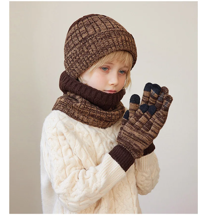 Winter Children Hat Scarf Gloves Set Knitted Beanie Thicken Velvet Lining Hats for Boys Girls Neck Warmer Scarves Mitten 4-10Y 4
