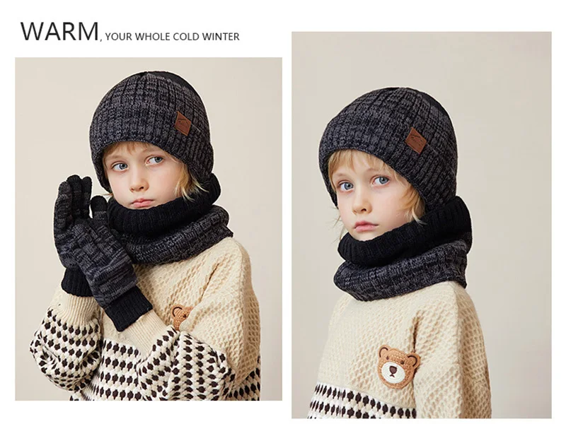 Winter Children Hat Scarf Gloves Set Knitted Beanie Thicken Velvet Lining Hats for Boys Girls Neck Warmer Scarves Mitten 4-10Y 6